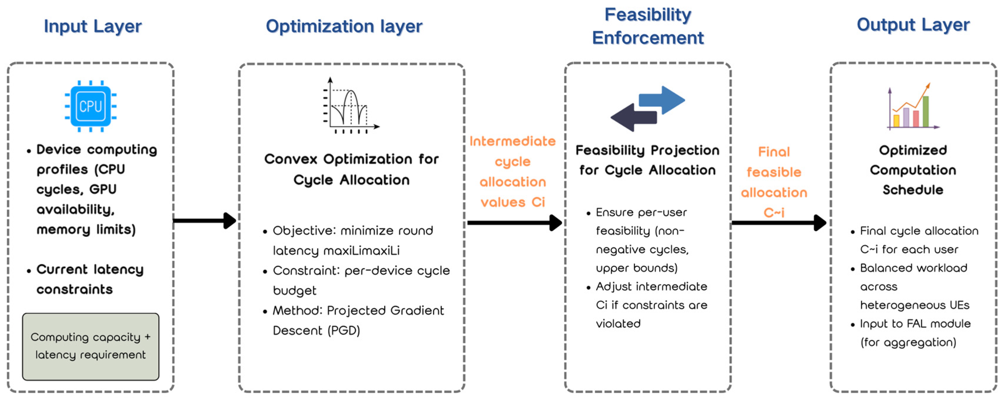 (2) Computation Scheduling Module (CSM), which distributes computation cycles among heterogeneous edge servers to minimize round latency;