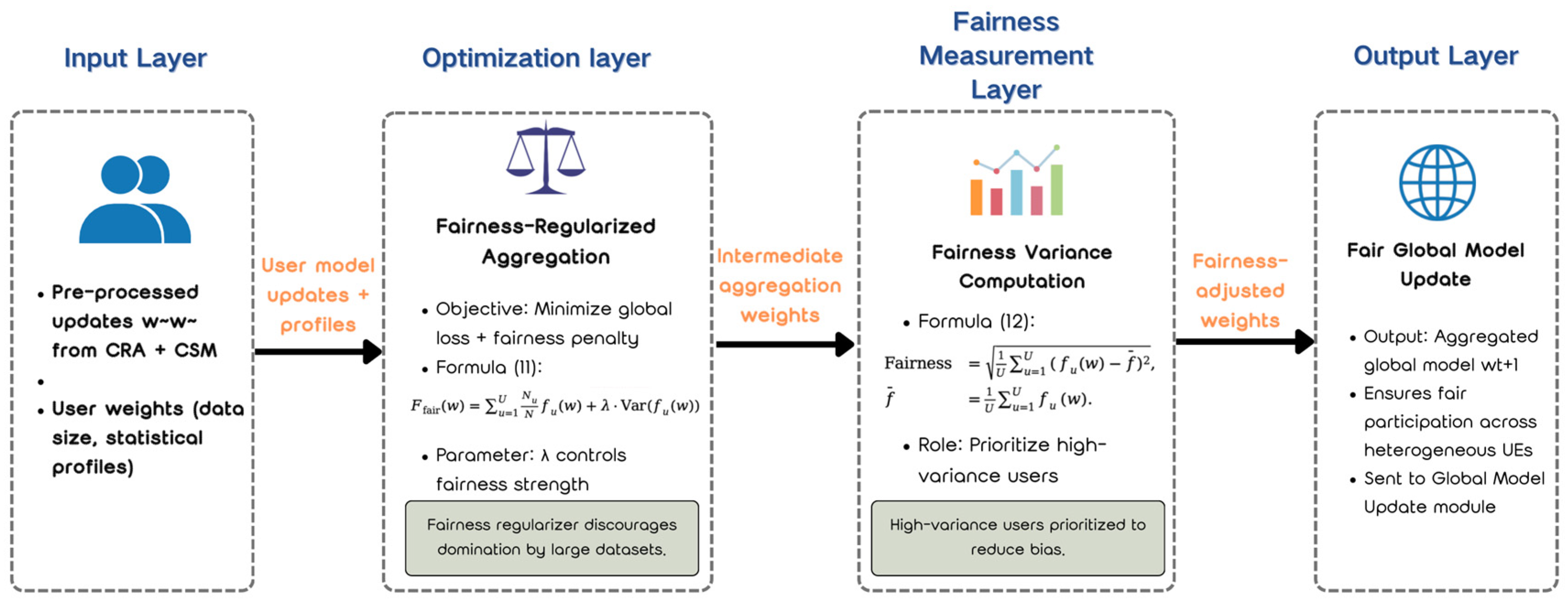 (3) Fairness-Aware Learning Module (FAL), which introduces fairness constraints to ensure balanced participation among UEs with heterogeneous data distributions [