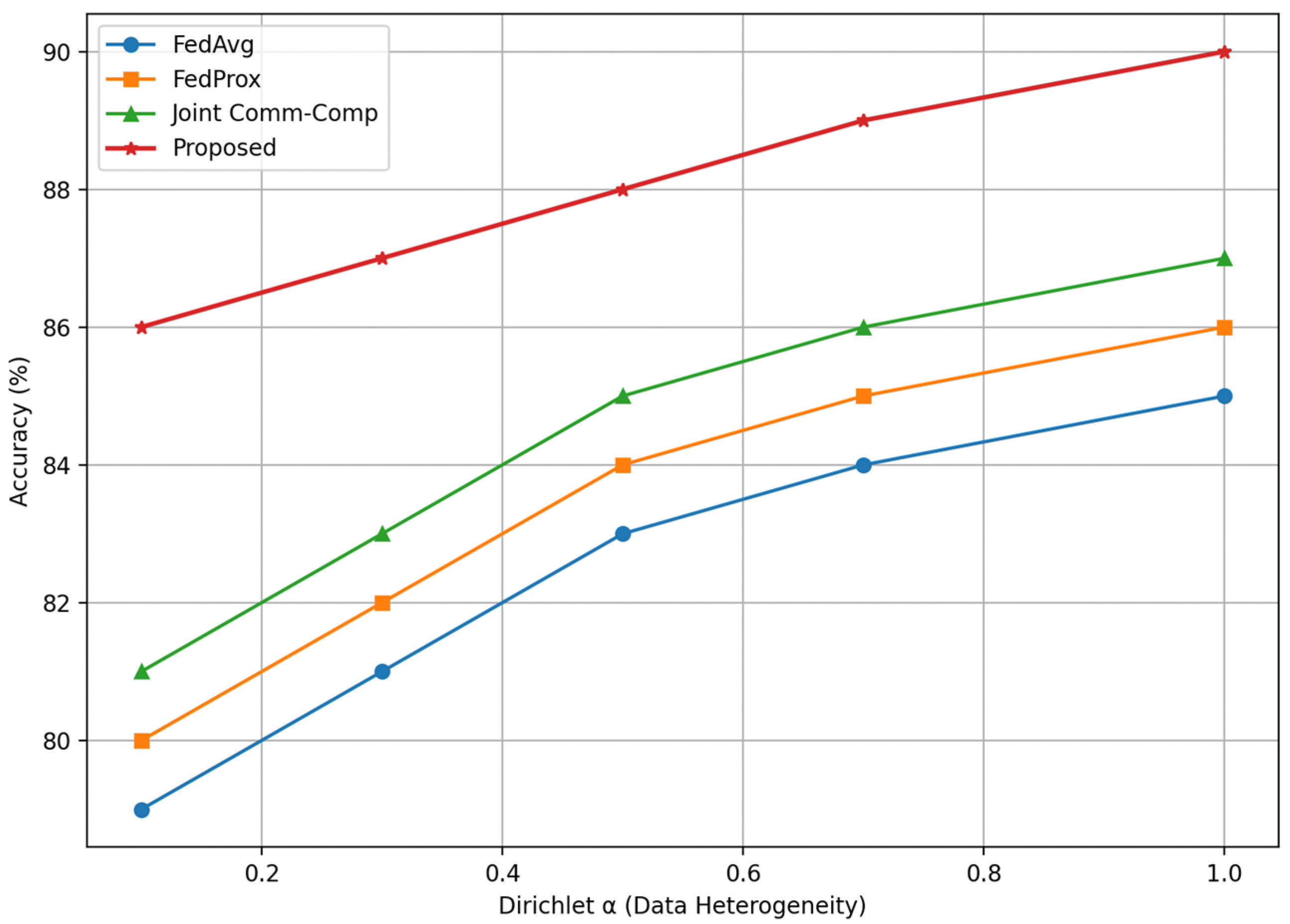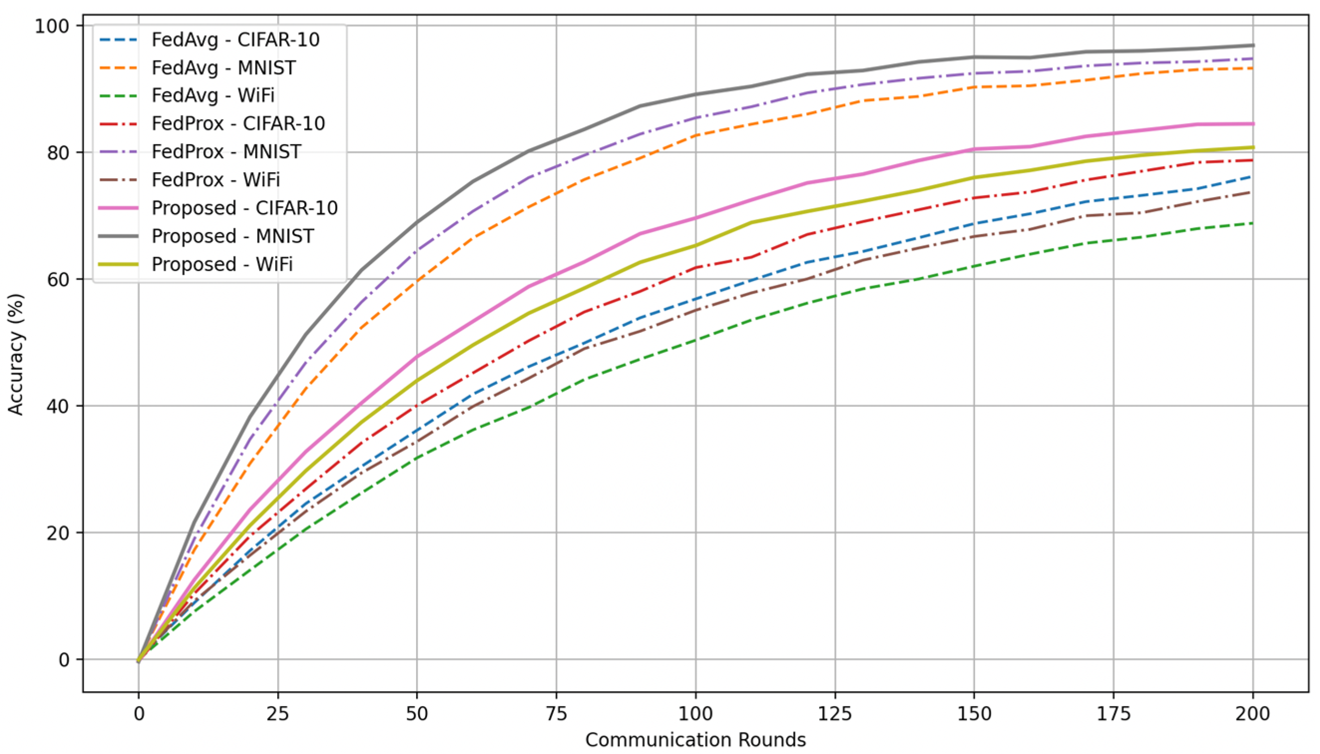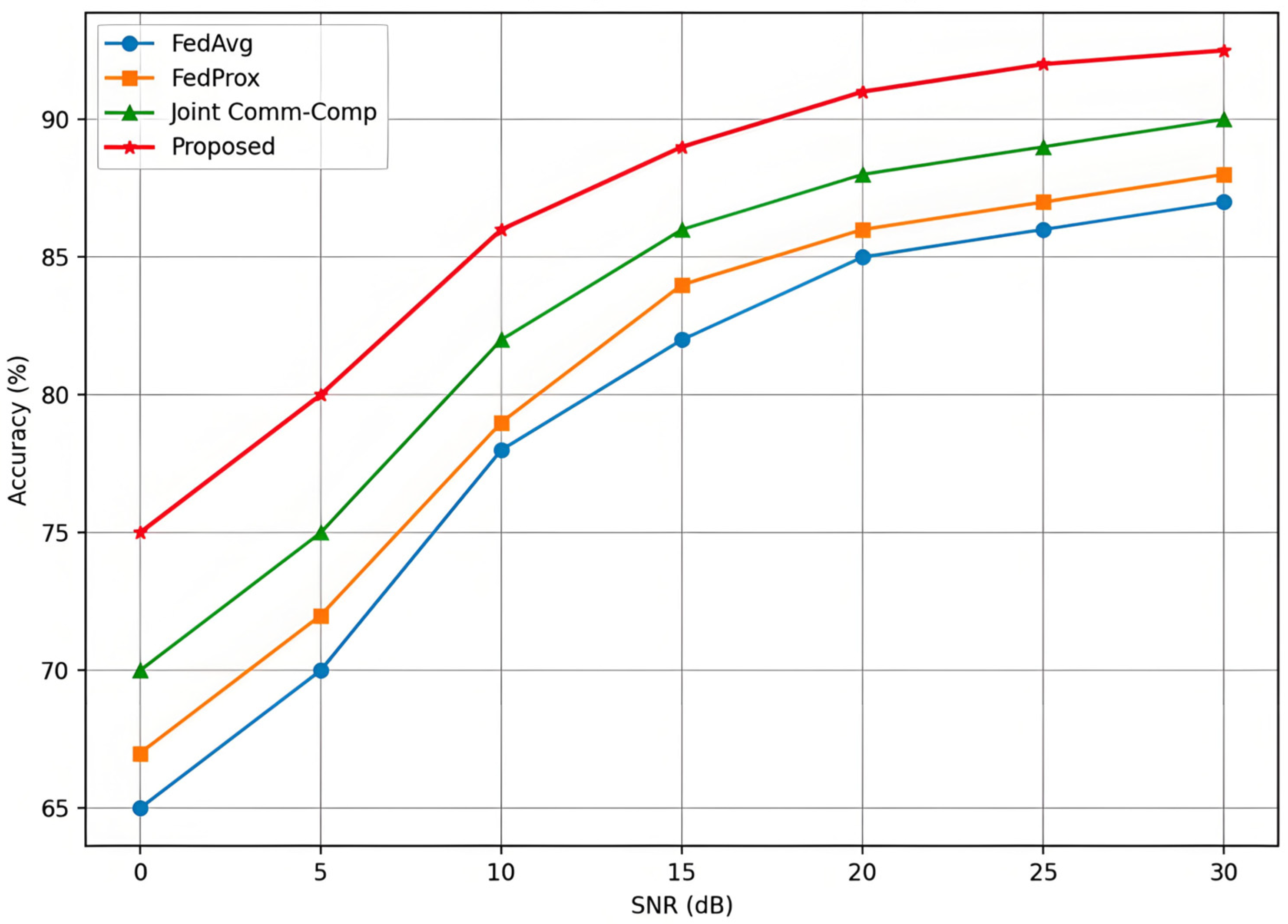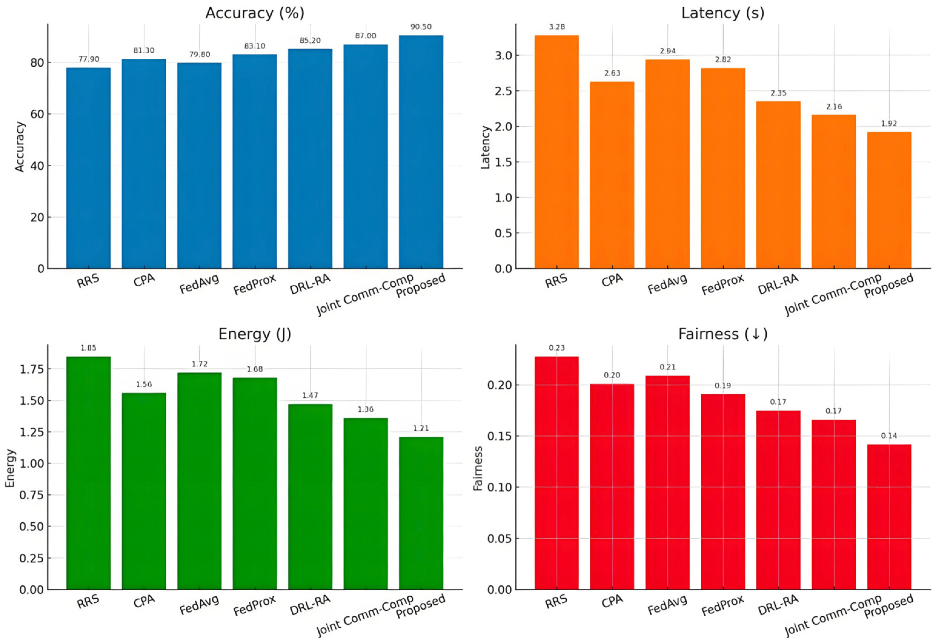 31]. In contrast, the proposed framework integrates communication, computation, and learning objectives within a hybrid design that combines convex optimization, DRL adaptability, and fairness-aware scheduling to jointly optimize accuracy, latency, energy, and equitable resource distribution under dynamic wireless conditions [