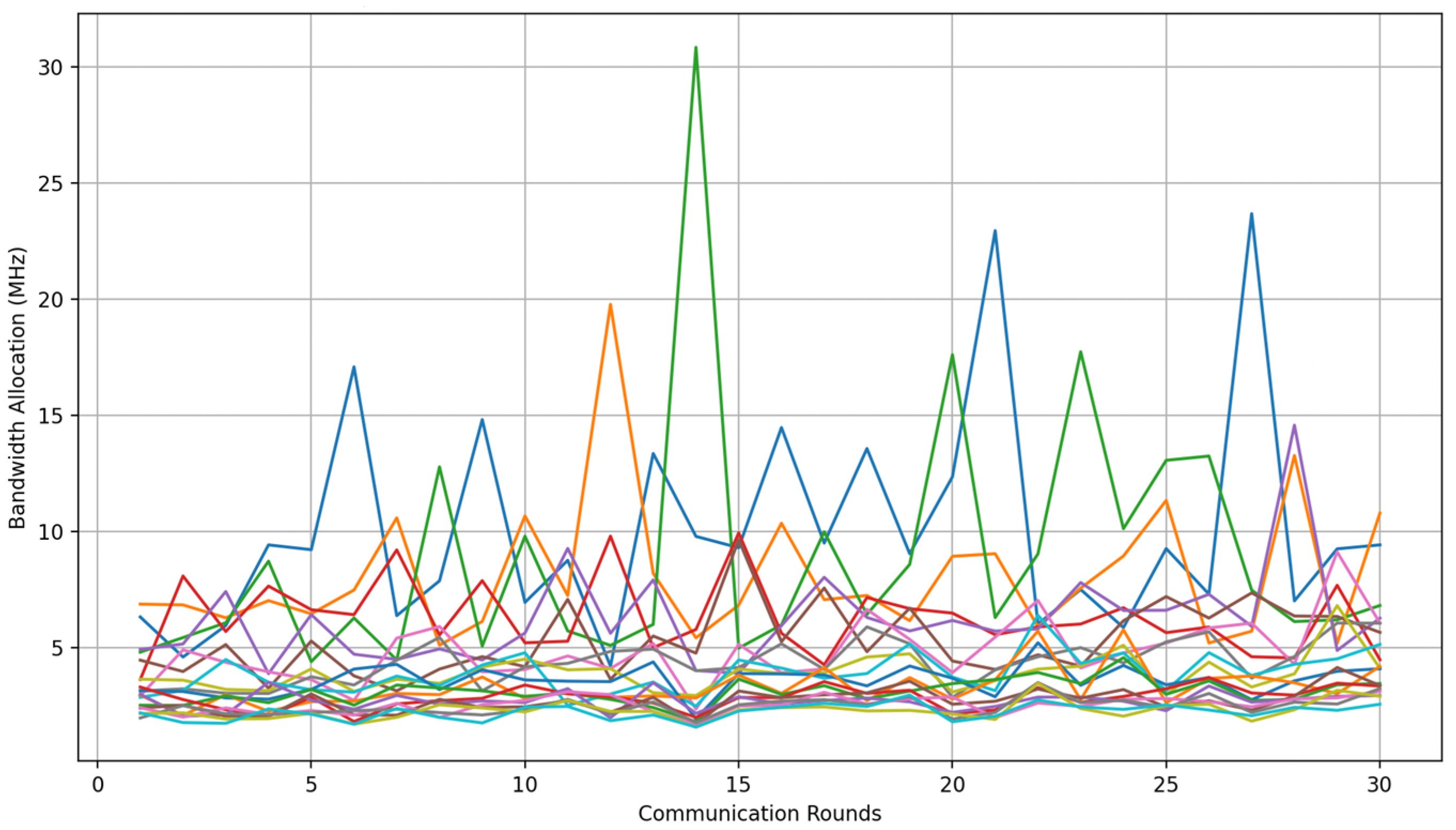 Bandwidth allocation versus communication rounds for 20 representative users. The adaptive and fairness-driven strategy of the CRA module is evidenced by the fluctuating allocations that correlate with real-time channel state information.