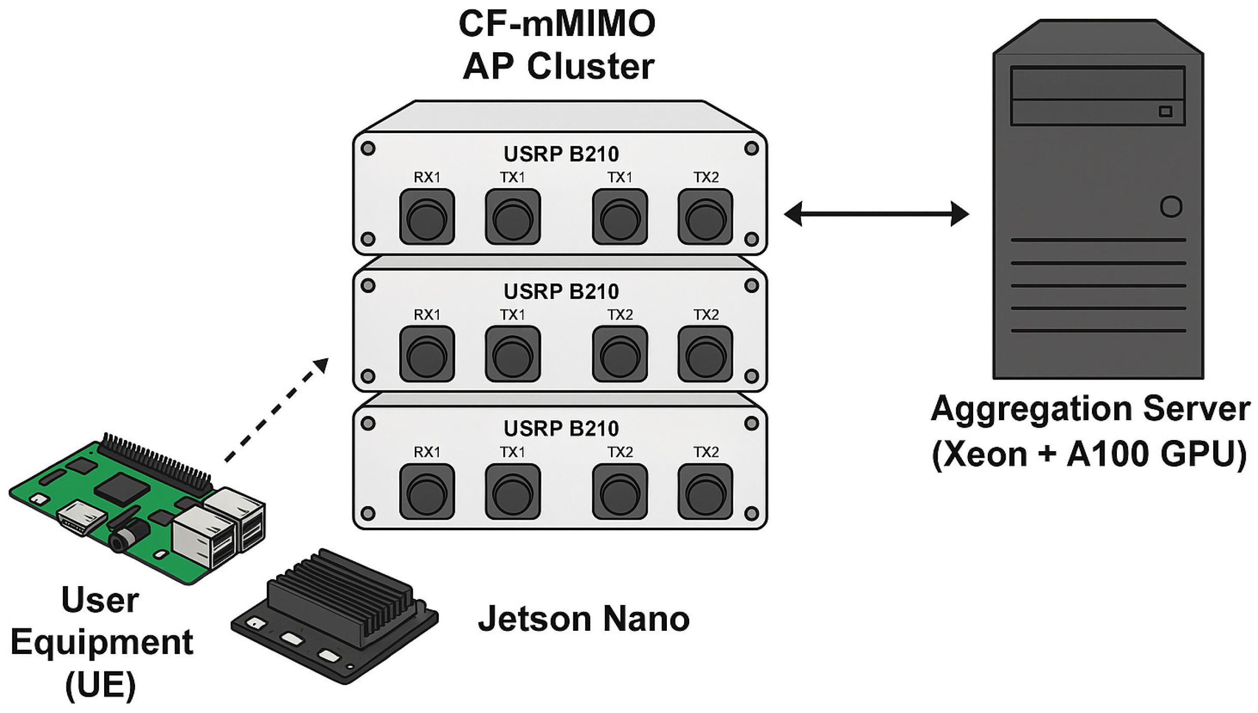 Schematic overview of the experimental setup: heterogeneous edge devices (Raspberry Pi 4 and Jetson Nano) connected to a CF-mMIMO access point cluster implemented with USRP B210 units, linked to a central aggregation server (Xeon + A100 GPU).