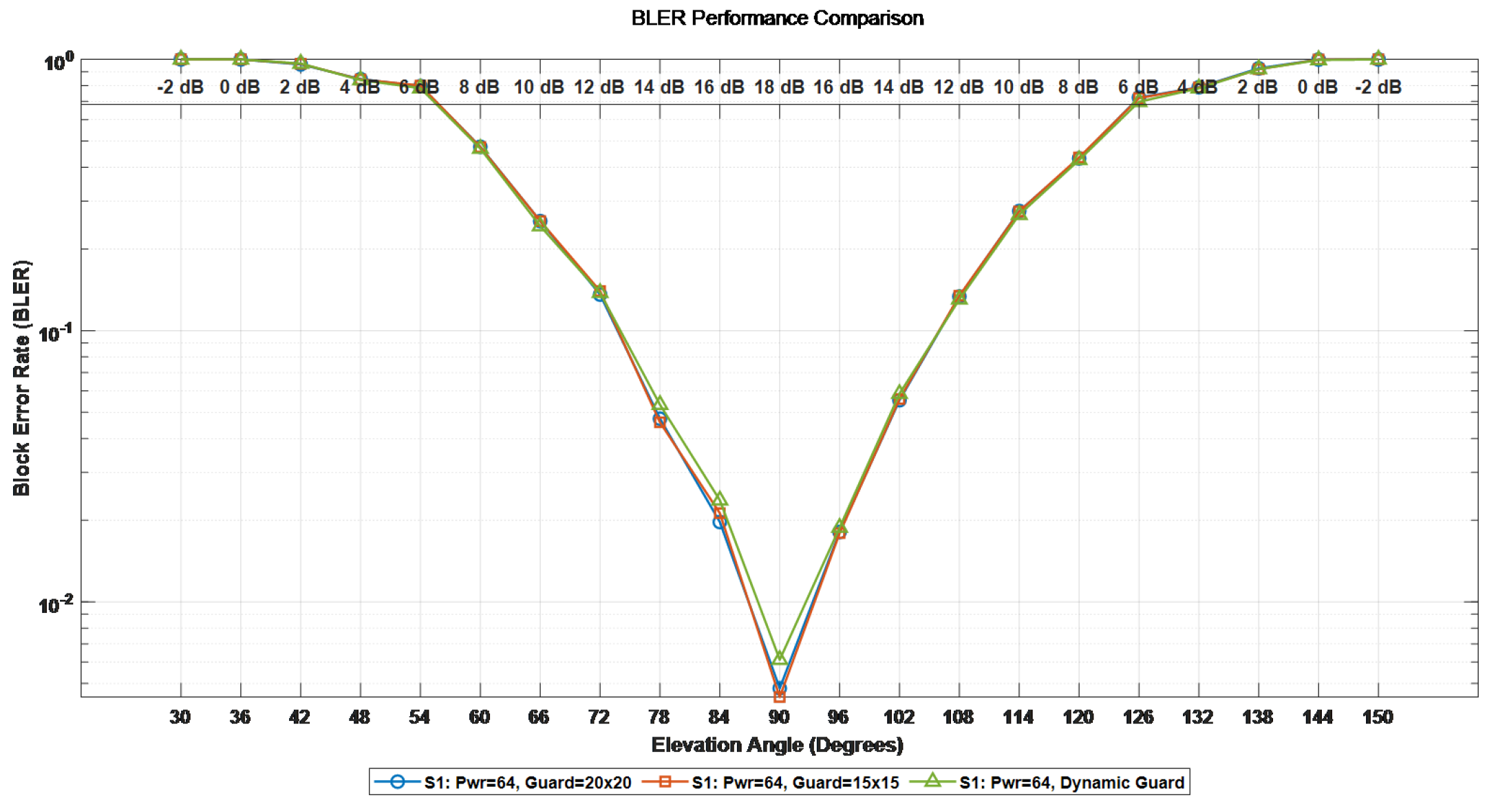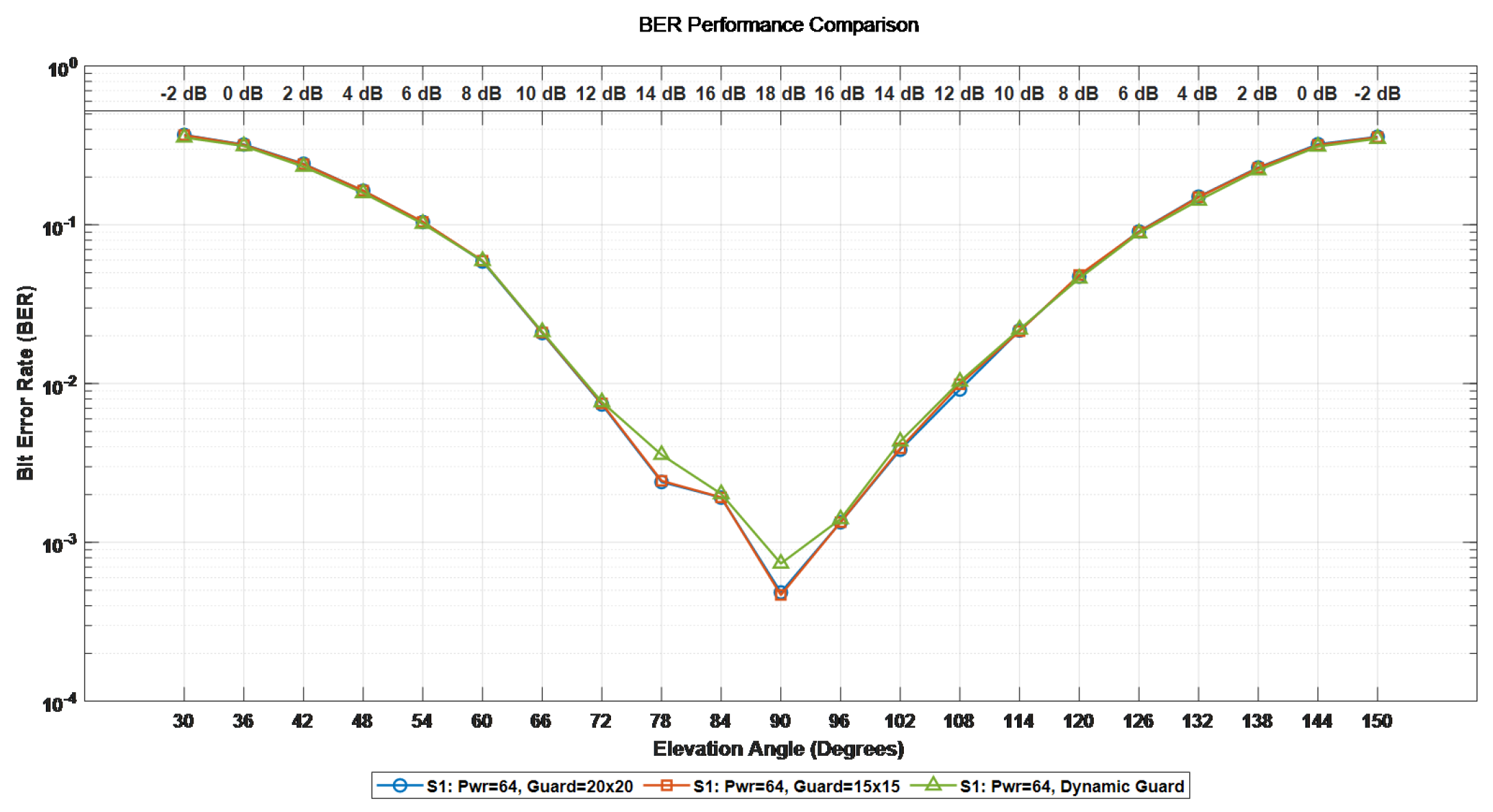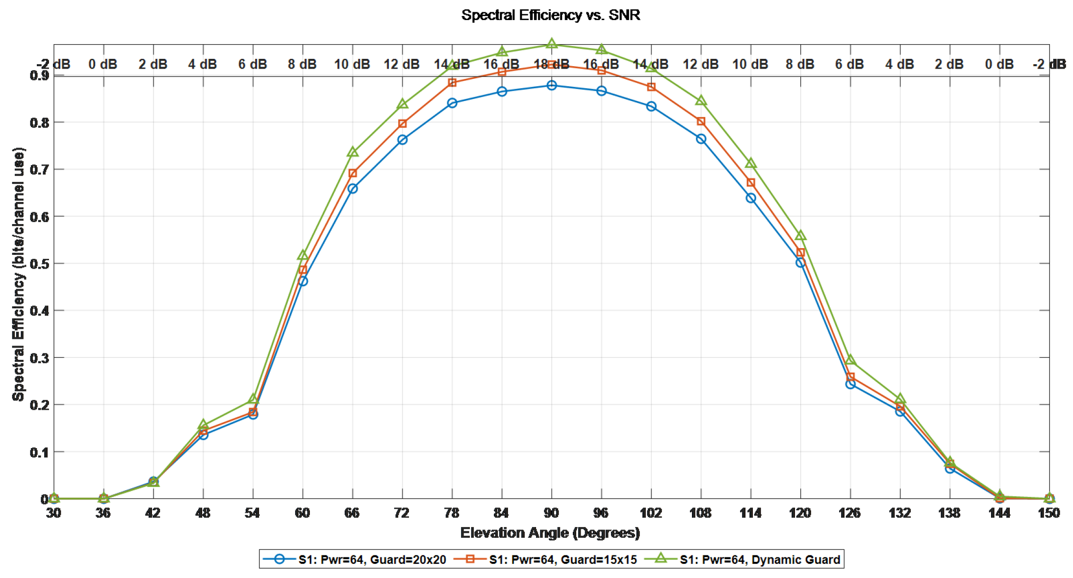 Section 5.1 and the predicted values of the sub-channel signal-to-noise ratio, Doppler offset and delay, the performance of the proposed adaptive frame configuration adjustment scheme in the OTFS system in the satellite communication scenario is demonstrated. We have configured M = 288 subcarriers, N = 14 symbol numbers, the satellite orbit altitude is 600 km, and the speed of the high-speed moving object is 10 Mach. First, an adaptive symbol loading simulation verification was conducted. We respectively set up three pilot protection band configurations, namely [20 × 20], [15 × 15], and the adaptive pilot protection band setting. The differences in system BER, BLER, and spectral efficiency under the three Settings were compared. Since the gain of the side path in satellite channels is usually very small, in this paper, when conducting threshold detection, the threshold is set to 0.05. Ensure that all valid paths in the channel can be detected and the interference of noise can be filtered out at the same time. The corresponding relationship between the elevation Angle and the signal-to-noise ratio in adaptive protection band modulation is shown in
