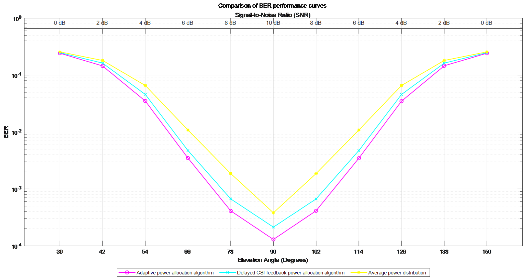 Figure 11 shows the impact of different power allocation strategies on the system BER. The red line represents the adaptive power allocation algorithm, the blue line indicates the power allocation algorithm based on delayed CSI information, and the yellow line indicates no power allocation. The simulation shows that when the satellite is overhead and moves towards the ultra-high-speed moving body, the demodulation threshold of the proposed adaptive power allocation algorithm with BER =