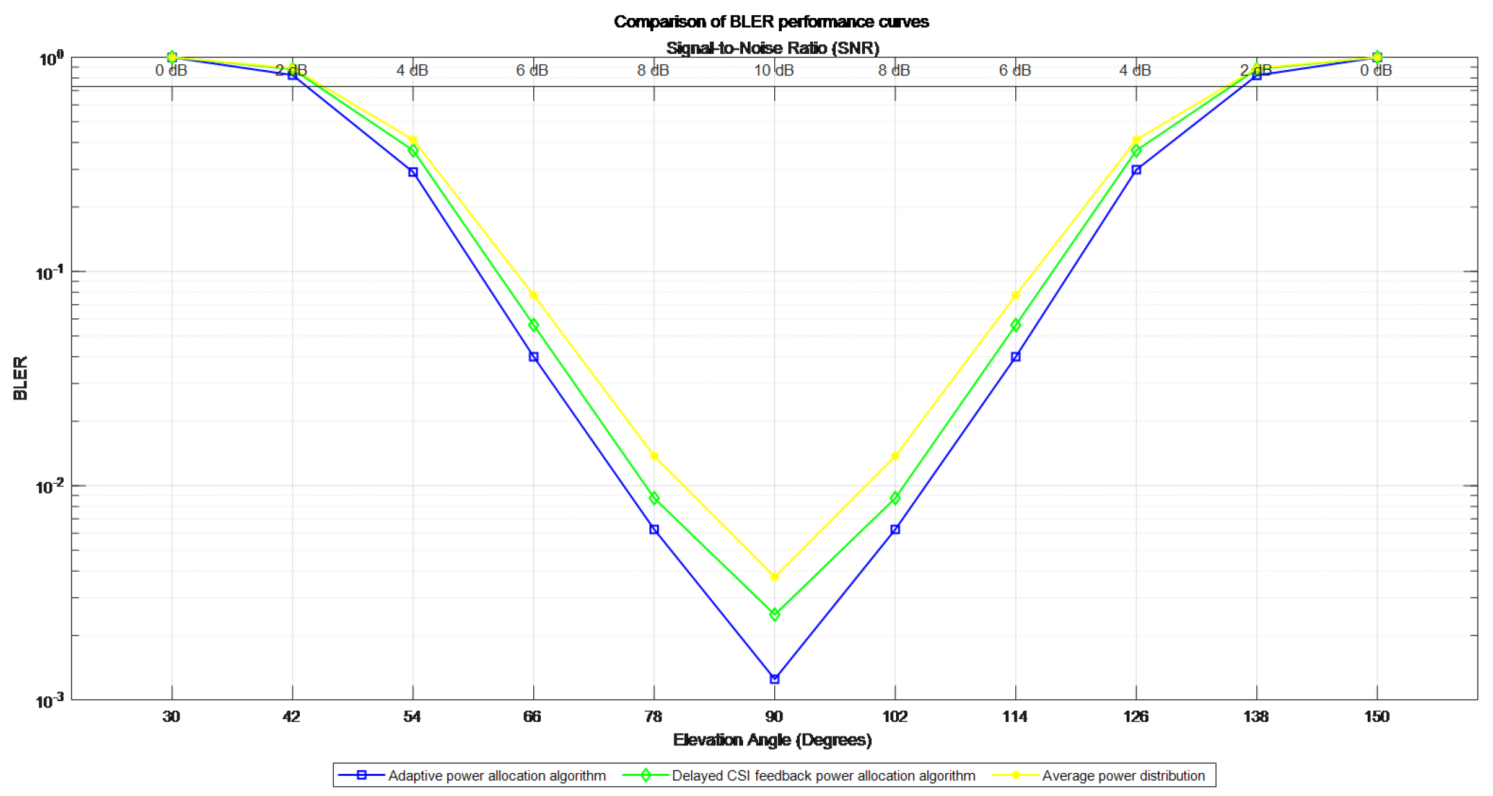 Figure 12 shows the impact of different power allocation strategies on the system BLER. The blue line in the figure represents the proposed adaptive power allocation algorithm, the green line represents the delayed CSI feedback power allocation algorithm, and the yellow line represents the average power allocation algorithm. The demodulation thresholds reaching BLER =