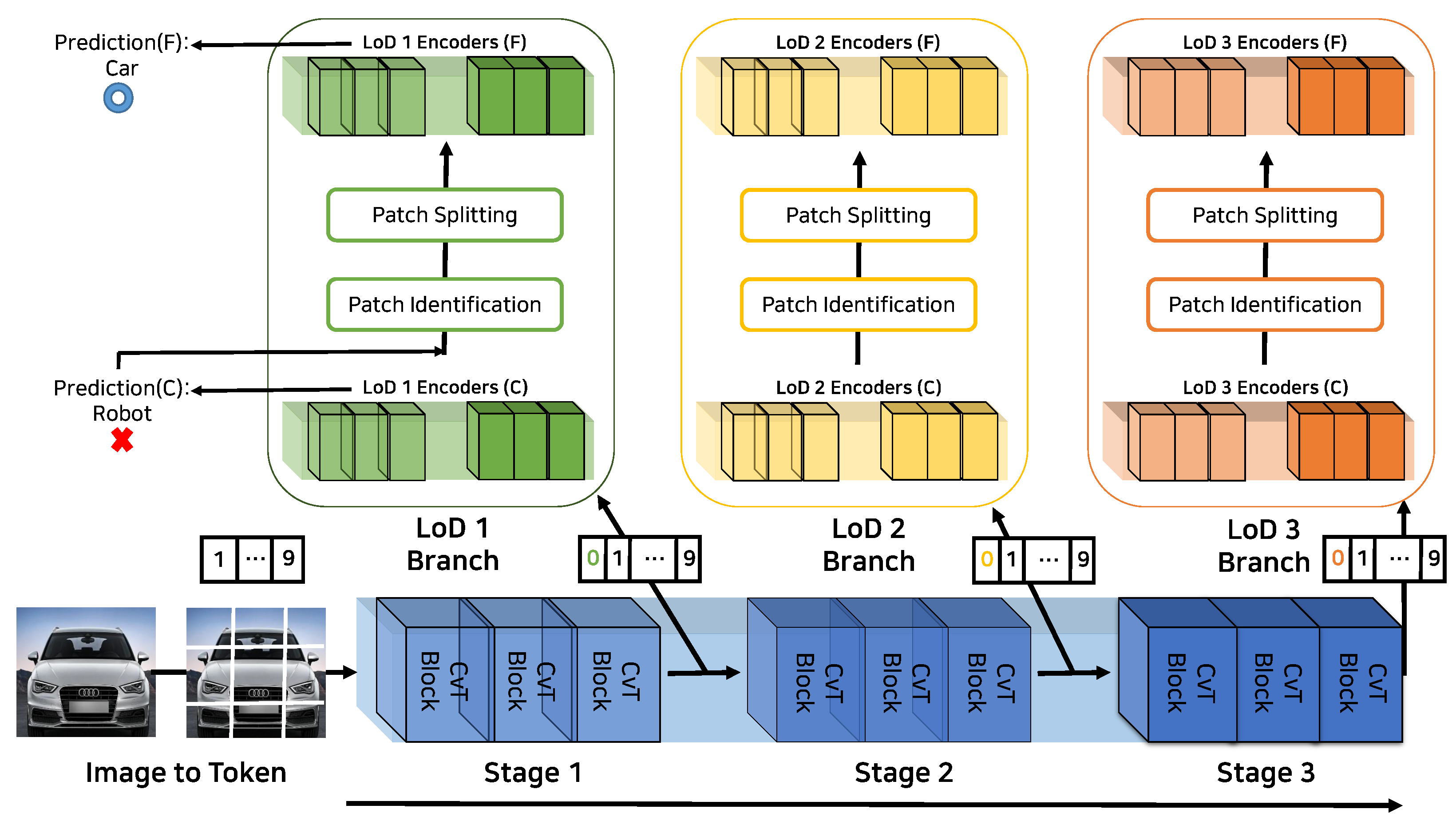 - We propose a unified architecture that integrates a CvT backbone with multiple LoD-specific ViT branch networks. This design enables the model to detect key features tailored to each LoD using the corresponding ViT-based branch network, as well as to extract collective features across all LoDs using a CvT-based backbone.