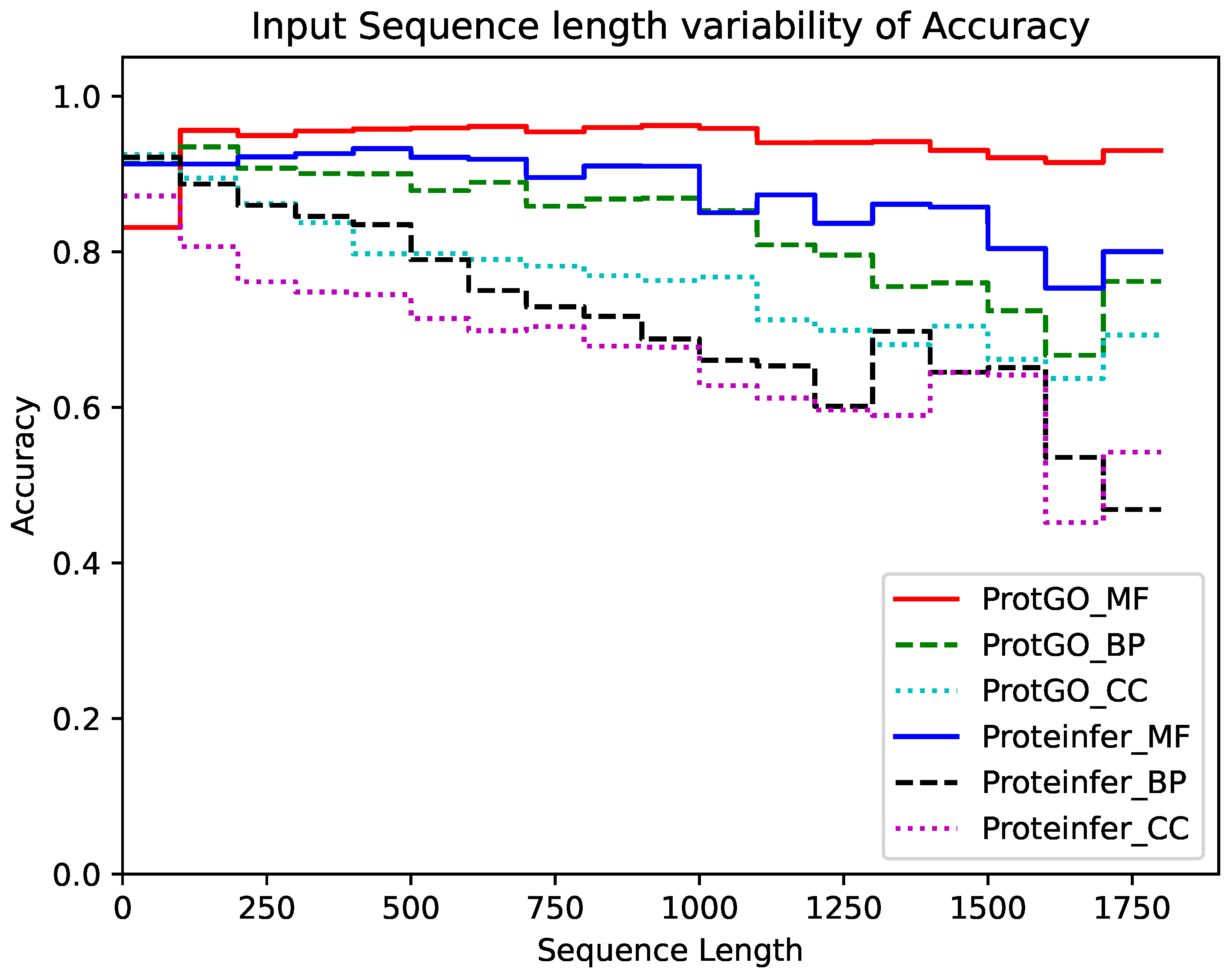 - Does ProtGO sustain accuracy across varying protein sequence lengths?