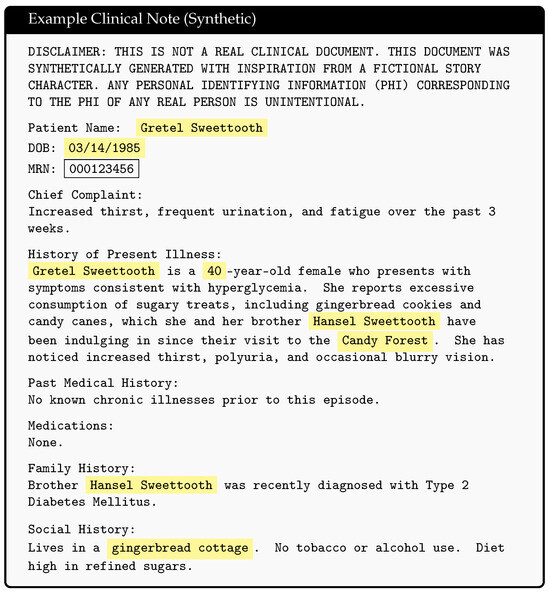 Example synthetic clinical note with identified PHI highlighted in yellow. PHI leakage results from false negatives in the de-identification software, an example of which is the MRN highlighted in the black box. Hansel and Gretel fairytale inspired synthetic clinical note was generated using Microsoft Copilot.