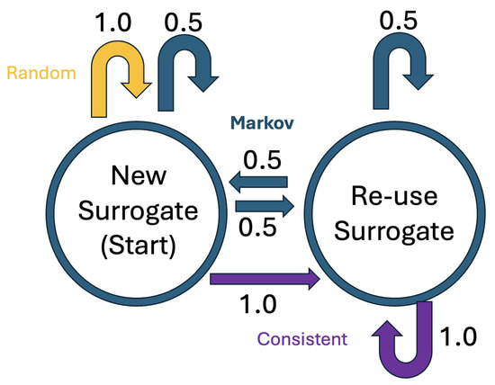 BRATsynthetic implements three HIPS substitution strategies: Consistent, Random, and Markov as well as a baseline “Simple” non-HIPS strategy, where identified PHI entities are replaced by the entity name. An example substitution is shown in Table 4. All three HIPS strategies are implemented as a Markov chain with two states, one that creates a new surrogate value and another that repeats the previous surrogate value. The traditional Consistent strategy can be considered a simple, degenerate Markov chain with self-transition probability of 1.0. The initial state always creates a new surrogate value, but the subsequent transitions vary between strategies, as shown in Figure 3. The Consistent strategy always maintains the previous surrogate value, the Markov strategy selects a new surrogate half the time, and the Random strategy always selects a new surrogate. The surrogate values are selected at random from the faker [35] library for each occurrence of each type of entity.
