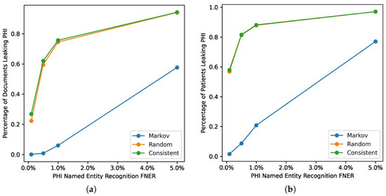 Our work suggests that the Markov substitution strategy allows for a larger release corpus size with the same or lower PHI leakage risk relative to Consistent or Random substitution strategies. This is true for a range of PHI entity counts and FNERs, as shown in Figure 7. Our results in Figure 4, Figure 5 and Figure 6 focus on critical PHI, but the protective effect shown in Figure 7 applies to any PHI entity. We evaluated critical PHI because of the difficulty in assessing the impact or liability of inadvertent non-critical PHI release, similar to other work that focused on names only [48].