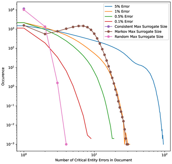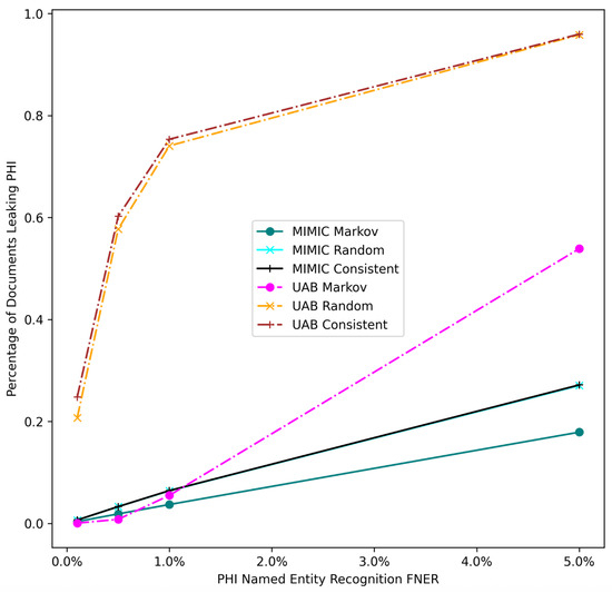 We evaluate the protective ability of surrogate addition on the UAB Corpus, UAB Discharge Corpus, and the MIMIC Corpus by focusing on “critical” PHI as specified in Table 2 under the “Critical PHI” column. Table 5 provides corpus statistics on the critical entity distributions of these corpora. We define an entity as “critical” if a single FN for that entity (MRN is one such example) is sufficient to identify a patient and require immediate legal disclosure of the breach. An FN by de-identification software or humans in this critical category of PHI may be commonly identified even in a haphazard fashion by a casual reader of the document when the document employs no surrogate substitution (like MIMIC) or uses substituted text as shown in Table 4 under the Consistent strategy. However, a single FN would not be obvious to a reader if a Random or Markov strategy is used, since the real name would not constitute the largest minority surrogate class. Thus, the ability to detect the real name as shown in Table 4 is dependent on the overall FNER, the distribution of critical entities and FN errors within those entities and the substitution strategy used. Using our UAB and MIMIC Corpora, we simulate and assess three different resynthesis strategies for surrogate information: “Consistent”, “Random”, and “Markov” under four different FNER (0.1%, 0.5%, 1%, and 5%). Leakage rates are computed at the document level. A leak is considered to occur if the PHI signal (measured by the critical PHI FN count) exceeds the injected noise as measured by MSRS. In essence, MSRS represents the maximum frequency with which a given surrogate can repeat within a document; when the number of false negatives does not exceed this number, any leaked PHI is statistically indistinguishable from synthetic surrogates. In practice, this means that for the Consistent strategy where the same surrogate is repeated, any FN in a critical entity constitutes a document leak, whereas for the Random, and Markov strategies this only occurs when FN errors exceed the MSRS. A leak at the patient level as one or more document leaks. Since results can vary depending on the distribution of FN errors in a corpus, we average our results over 1000 FN error generation simulations using different random seeds. Our leakage calculations and simulations are available at https://github.com/uabnlp/BRATsynthetic (accessed on 6 September 2025) [21] and were performed using Python version 3.9.