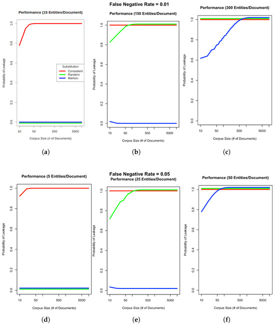 PHI leakage on synthetic corpora. Charts (a–c) show the probability of PHI leaking given a 1% PHI FNER and varying input corpus sizes with either 15, 150, or 300 entities (critical or otherwise) per document. Charts (d–f) assume a higher FNER of 5% with 5, 25, or 50 entities per document. Although leakage results are reported at the document level, patient level calculations would be the almost same but would use a pooled entity count given that multiple documents from the same patient would be aggregated. Red, green and blue lines indicate Consistent, Random and Markov substitution respectively.