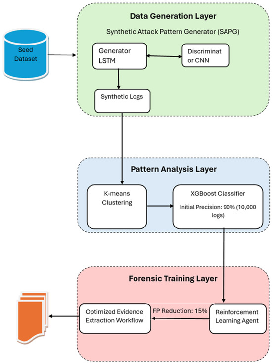 The three layers operate in a pipeline fashion: the data generation layer produces high-quality synthetic logs, the pattern analysis layer labels and formats such logs, and the forensic training layer uses RL to extract and verify forensic evidence. The framework’s architecture is scalable, compliant with the law, and deployable to low-resource platforms (e.g., Google Colab). Figure 1 illustrates the framework structure and flow of data between layers.