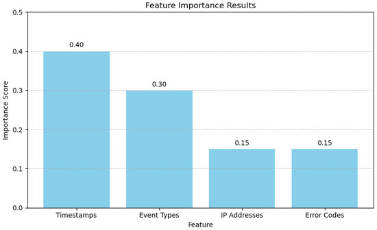 Table 9 displays the absolute importance values for all features, and Figure 3 illustrates their relative contributions. The findings confirm that event-based and temporal attributes are the most discriminative between attack and benign logs. Furthermore, the high importance values of timestamps demonstrate the efficacy of the designed TFL, which is specifically designed to preserve temporal sequences in synthetic data. In future studies, the incorporation of advanced interpretability techniques, such as Shapley additive explanation (SHAP) values or permutation importance, could facilitate an improved understanding of nonlinearity in feature interactions and increased forensic interpretability.