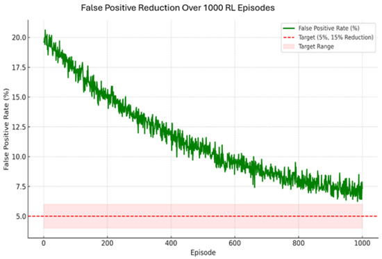Curve of false positive reduction over 1000 RL episodes (simulated data). The graph illustrates three phases of learning: early steep decline, gradual flattening, and eventual convergence, resulting in a 17% reduction of false positives to a final FPR of 3%.