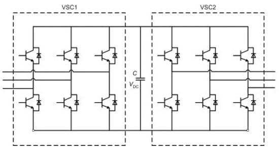 The power electronics interface employed in this study consists of a dual-converter topology designed to emulate real-world grid-connected wind energy systems. Each converter—one linked to the rotor circuit and one to the grid—comprises three legs with upper and lower IGBT switches. These converters facilitate bidirectional power transfer and enable controlled fault injection scenarios. The schematic structure is presented in Figure 3.