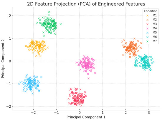 Two-dimensional PCA projection of the engineered feature space. Fault classes (M1–M7) form well-separated clusters, indicating strong discriminability.