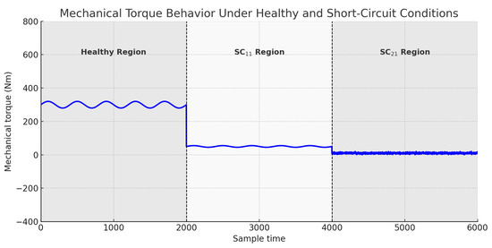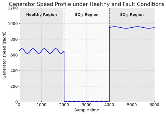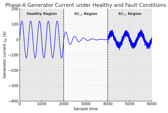 In the proposed fault detection framework, a total of 12 time-domain signals were collected from the wind energy conversion system (WECS) under both healthy and faulty operating modes. These measurements include mechanical, electrical, and power-related variables sourced from the generator side, grid interface, and control paths. Key variables such as shaft torque, angular velocity, phase currents, DC link voltage, and output power were sampled at a frequency of 20 kHz, ensuring high temporal resolution for both transient and steady-state behavior. Additionally, axis-transformed components (d and q) were extracted using the Park transformation to enhance observability of system dynamics. Table 3 presents a comprehensive summary of these variables, along with their respective signal codes and dynamic ranges as recorded across all scenarios.