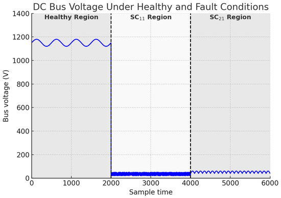 DC bus voltage under Healthy, SC11, and SC21 operating conditions.