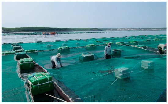 Cage aquaculture is an efficient marine farming method that uses large floating buoys and net-cage structures to concentrate fish within defined marine areas for precise stock management and growth monitoring. The cages’ permeable design both shields stock from external disturbances and promotes seawater exchange and oxygen transport. In Penghu (23.57° N, 119.58° E), an offshore island county of Taiwan located in the Taiwan Strait, more than 2000 cages, as shown in Figure 1, produce several hundred to several thousand tons annually across species such as grouper, sea bass, eel, clams, and scallops, underscoring the sector’s regional importance. Penghu’s cage-aquaculture environment and planning foundations can be linked through three complementary studies by Shih [1,2,3]: first, Shih visualized benthic redox-potential and sulfide profiles beneath and around cobia cages, revealing a reduction gradient indicative of seabed conditions that support stable operations. Second, Shih combined GIS with analytic hierarchy process (AHP), a multi-criteria decision-making method, to rank Penghu coves by multi-criteria suitability—hydrodynamics, depth, accessibility, water quality, and use conflicts—thereby providing a replicable siting tool for marine aquaculture. From a governance perspective, Shih then outlined development and environmental-management strategies for Taiwan’s cobia industry, including zoning, monitoring, waste handling, and disease and feed management. Complementing these foundations, Lan et al. evaluated the investment feasibility of large submersible cage culture for snubnose pompano and cobia in Taiwan [4], and Tang et al. assessed the engineering feasibility of deploying cage aquaculture within offshore wind-farm areas around Taiwan [5]. Collectively, this body of work supports Penghu’s competitive, high-quality cage-aquaculture sector that meets strong local demand and contributes to export markets.