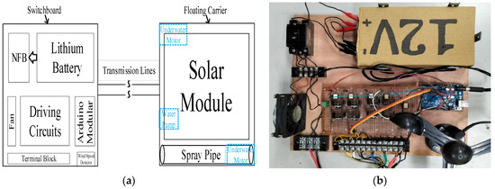 Overview of the floating solar-tracking system: (a) Functional block diagram of FPV subsystems and their interactions; (b) Prototype Arduino-based controller and driver circuitry.