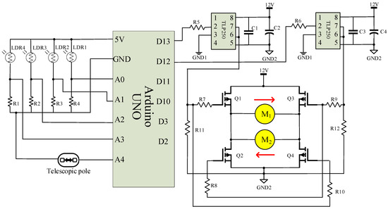 Optimal performance of the solar-tracking system is achieved using an Arduino module as the central control unit. It manages the operation of the underwater motors and telescopic rods. The corresponding driving circuit diagram is shown in Figure 5. Figure 5 only shows the circuit for the underwater motor, while the circuits for the solar tracking and spray systems are the same. To accurately detect changes in sunlight intensity, the system employs Light Dependent Resistors (LDRs), as shown in Figure 5 from LDR1 to LDR4. Among them, LDR1 and LDR2 are responsible for the tracking function of the carrier platform, while LDR3 and LDR4 are responsible for the tracking function of the solar panel’s tilt angle. Taking the carrier platform tracking function as an example, when the light sensors LDR1 and LDR2 detect changes in solar radiation, the light signal is converted into a voltage signal, which is then transmitted to the A0 and A1 input ports of the Arduino module for signal processing. After processing the signal internally, the Arduino outputs the result to Pin 12 and Pin 13, which are connected to the full-bridge circuit. Based on the received signal, the full-bridge circuit controls the forward and reverse rotation of the underwater motor under the carrier platform. This ensures that the carrier platform solar-tracking system can accurately follow the sun’s position, maximizing solar energy collection. The implementation diagram of Figure 5 is shown in Figure 4b above. This configuration utilizes TLP250 optocoupler drivers and Metal-Oxide-Semiconductor Field-Effect Transistors (MOSFETs) to control the underwater motors, telescopic rods, and water pumps. The TLP250 converts the 5 V PWM control signals from the Arduino into 12 V gate-drive pulses, providing both optical isolation and gate-voltage amplification. The TLP250 device located near the Arduino UNO drives transistors Q1 and Q4 simultaneously, while the other TLP250 controls Q2 and Q3. By alternately switching these transistor pairs, the full-bridge circuit enables bidirectional current flow through the underwater motor, allowing forward and reverse rotation. This configuration enhances driving capability, ensures fast switching speed, reduces electrical noise, and provides stable and efficient operation between the low-voltage control circuit and the high-current power stage.