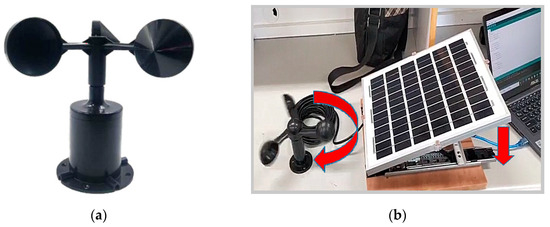 Wind-speed sensor and verification setup: (a) Anemometer; (b) Functional-verification test, where the arrows indicate that when the wind speed reaches the preset threshold, the anemometer cups rotate and the solar panel tilts downward to a horizontal position.