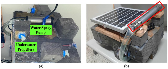 Water-spray cooling system: (a) Water pump and underwater propellers; (b) PVC spray header mounted on the solar module.