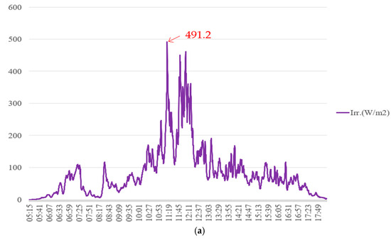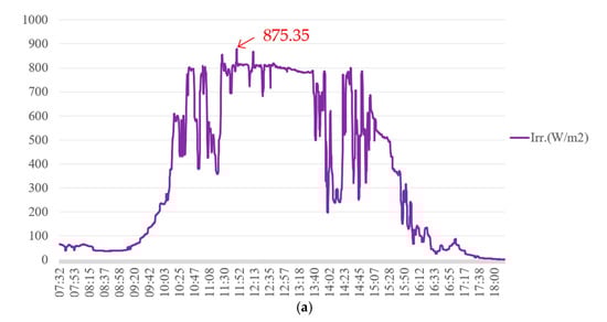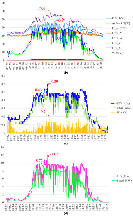 In the laboratory, a halogen lamp was used as an artificial radiation source for preliminary functional verification of the FPV tracking and control circuits. For performance evaluation, the system was tested under natural outdoor solar irradiance in Penghu, Taiwan (23.57° N, 119.58° E). The irradiance was recorded with a pyranometer at a 20 s sampling interval. Representative irradiance profiles for sunny and cloudy conditions are shown in Figure 11a and Figure 12a, respectively. For comparison, a ground-fixed system with an inclination angle of 23° was also fabricated and tested alongside the floating system. The spray cooling system was activated at a temperature of 45 °C, with sampling intervals of 20 s. The data logger recorded multiple parameters, including voltage, current, solar module temperature, and ambient temperature for both the floating and ground-fixed systems. Table 3 provides a summary of the sensor equipment employed in this study for monitoring the electrical and environmental parameters of both the floating and fixed solar systems. The ACS 712 current sensor was used to measure module output current with a full-scale range of 0–5 A, while the CDR-96 digital ammeter and voltmeter panel provided accurate current and voltage readings up to 100 V and 10 A. For thermal monitoring, the DS18B20 digital temperature sensor was utilized to measure internal module temperatures between −55 °C and +125 °C, while a K-type thermocouple was used to monitor surface and ambient temperatures, operating within −40 °C to +105 °C. Wind speed was assessed using an ABS-cased anemometer rated from wind scale 0 to 16, allowing estimation of environmental wind load impact on the floating structure. In addition to these sensors, solar irradiance was continuously measured using a pyranometer (Model JDA-W). The device features a measurement range of 0–2000 W/m2, with a resolution of 1 W/m2 and an accuracy of ±0.05% F.S. ± 2 digits. This pyranometer was used to monitor the real-time irradiance incident on the solar modules, providing essential reference data for evaluating the performance of both the floating and fixed PV systems. A Graphtec GL220 data logger was employed to capture and record all sensor signals, capable of measuring analog voltage (20 mV to 50 V), thermocouple-based temperatures (−200 °C to +100 °C), and relative humidity (0–100% RH) via external modules. The integrated system enabled high-resolution, multi-channel data acquisition at 20 s intervals, providing a robust dataset for performance analysis under varying climatic conditions. The above results are compiled into the power generation curve graphs shown in Figure 11 and Figure 12.