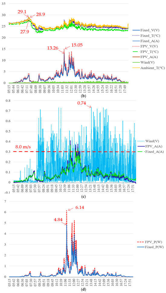 In Figure 11a, the solar irradiance profile under clear-sky conditions is illustrated. The irradiance increased steadily after sunrise, reaching a peak of approximately 870–900 W/m2 around midday, and then gradually declined toward sunset. This stable irradiance curve reflects typical sunny-day behavior and provides the reference baseline for evaluating system performance. Observing the curves in Figure 11b, it is clear that the temperature of the fixed solar module (Fixed_T (°C)) is generally higher than that of the floating system (FPV_T (°C)), with a peak temperature reaching 57.4 °C at 12:26. In contrast, the temperature of the floating system’s module (FPV_T (°C)) remains consistently below 45 °C. Additionally, the voltage (FPV_V (V)) and current (FPV_A (A)) curves of the floating system, shown in Figure 11c, exhibit higher amplitudes compared to those of the fixed system (Fixed_V (V) and Fixed_A (A)). During the period from 13:44 to 15:09, there was noticeable shading, resulting in a significant drop in both voltage and current. In terms of wind speed, the data shows significant variation due to the mild breeze on the day of testing, as indicated by the wind curve in Figure 11c, which did not reach the wind speed protection activation threshold of 8.0 m/s (0.3 V). Figure 11d illustrates the power output curves of the floating solar-tracking system (FPV) and the fixed-tilt system under mixed weather conditions, including a clear and sunny afternoon. The FPV system achieved a peak output of 11.53 W, significantly surpassing the fixed system’s peak of 8.72 W, yielding a 32.22% increase in power generation. This improvement is attributed to the system’s dual-axis solar tracking and the active spray-cooling mechanism, which maintained the solar module temperature below 45 °C, mitigating thermal losses. During the peak sunlight period, field measurements indicated that the incident solar irradiance exceeded 1000 W/m2, providing ideal conditions for evaluating system performance. The FPV system’s ability to track the sun’s position in real time enabled it to fully utilize the high irradiance levels, resulting in near-maximum output relative to the module’s rated capacity. These results confirm that under optimal environmental conditions, the proposed FPV system demonstrates superior energy harvesting capabilities compared to fixed installations, particularly in high-radiation coastal regions like Penghu. On the day of testing, the total power accumulation for the ground-fixed system was 8.90 Wh, while the floating system accumulated 11.14 Wh. The power generation difference between the two systems was 25.17%. It is indicated by the data that the developed system generates more electricity and is more suitable for independent power supply in cage aquaculture systems.