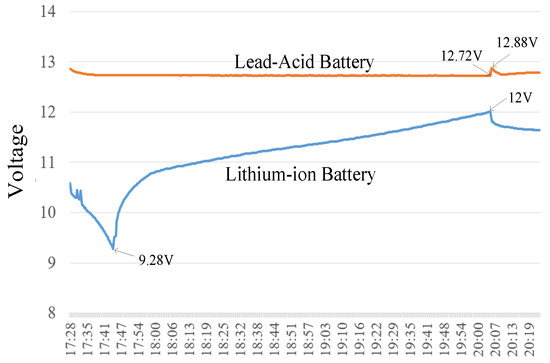 Charging voltage response of lithium-ion and lead-acid batteries with priority control.