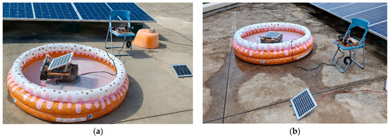 Figure 14 illustrates the installation of the developed floating solar-tracking system under different weather conditions. Figure 14a shows the setup used on the testing day described in Figure 11. The configuration includes a 12 V power control module, a wind speed sensor, a 10 W floating solar-tracking panel, and a 10 W fixed solar panel used for performance comparison. Figure 14b presents the setup used on the testing day shown in Figure 12. On that day, due to strong winds, the tilt angle of the solar panel was reduced to its minimum to minimize the risk of overturning.