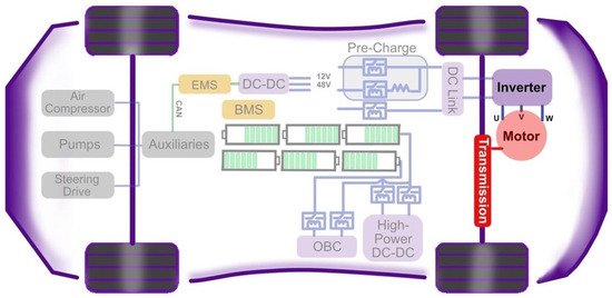 The high-voltage (HV) traction battery is the primary energy source in the electric drive train, and its accurate modeling is crucial for predicting available power, efficiency, and thermal behavior. A comprehensive overview of HV battery pack design aspects is given in [32], while system-level BMS functions for safety, monitoring, and state estimation are summarized in [33,34]. More recent reviews highlight how modern lithium-ion BMS face stringent constraints in terms of computational feasibility, cell balancing, communication bandwidth, and compliance with safety standards [35,36,37]. Different topologies for centralized, modular, and distributed BMS architectures are compared in [38], showing how voltage levels and modularity affect reliability and diagnostic coverage.