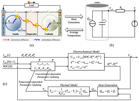 Multi-domain battery model: (a) electrochemical processes in a lithium-ion cell; (b) equivalent electrical circuit; (c) coupled electrochemical–thermal model with parameter updating and heat generation.