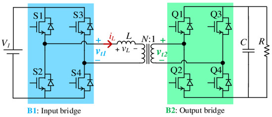 The DAB consists of two full-bridge stages: the input bridge (B1, blue) connected to the battery voltage , and the output bridge (B2, green) connected to the DC-link capacitor C and load R. The two bridges are linked by a high-frequency transformer with turns ratio and series leakage inductance L, which serves as the energy transfer element. Both bridges operate with 50% duty cycle square-wave modulation. The control variable is the phase shift between the switching patterns of the two bridges. This phase shift generates an average voltage across the leakage inductance L, producing a power transfer from the primary to the secondary [39,40]. The generalized average modeling (GAM) framework for the DAB is consolidated in [39,41], enabling compact analytical expressions such as those in (8). Extensions to frequency-domain harmonic balance modeling are discussed in [42], while steady-state modeling with circuit parasitics is proposed in [43].