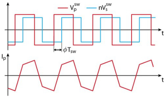 As illustrated in Figure 4, the red trace represents the switched voltage at the primary bridge, while the blue trace is the reflected switched voltage from the secondary bridge. When the two square waves are phase-shifted by , their difference produces a net voltage across L during part of the switching period, causing a triangular current waveform . The inductor current is governed by:
