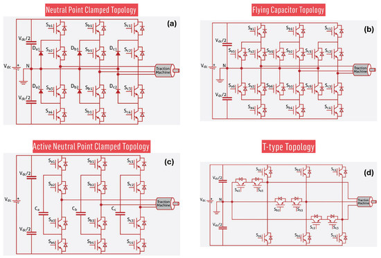 Common multilevel inverter topologies for traction applications: (a) Neutral Point Clamped (NPC), (b) Flying Capacitor (FC), (c) Active Neutral Point Clamped (ANPC), and (d) T-type. Multilevel structures increase the number of output voltage levels, reduce harmonic content, and lower device stress.