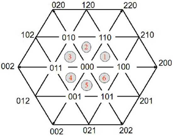 Space vector diagram for a three-level inverter: Each main sector is subdivided into four sub-sectors. The sub-sector location determines the set of active and zero vectors used in the synthesis.