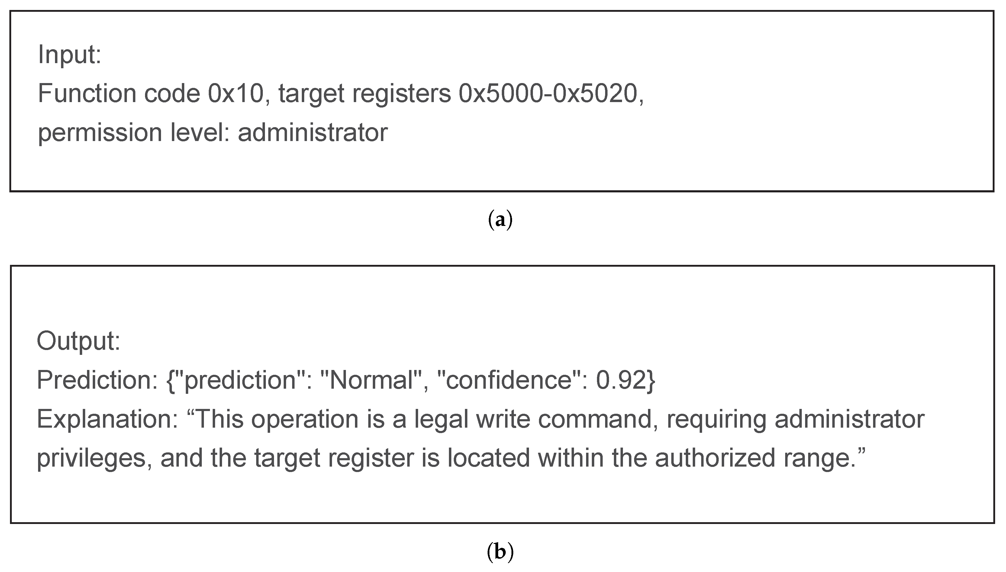 - LLM Semantic Embedding GenerationTo enhance the semantic richness and interpretability of the initial node features, a two–stage feature enhancement strategy is designed by combining the reasoning capabilities of large language models (LLMs) with the efficient adaptability of lightweight language models.Raw protocol text and device logs from node features are input into the LLM, and prompt engineering is used to guide the LLM in generating two types of outputs: one is a prediction label, which infers whether the operation type is normal or anomalous based on the text content; the other is a natural language description, which outlines the operation intent and potential risks. An example of the input and output of the LLM is shown in Figure 2.The original text, prediction label, and explanation are merged to form enhanced text as Equations (12) and (13), and the lightweight language model (LM) is fine–tuned using the objective functions from Equation (14) to Equation (16).The mask tokens in the enhanced text are reconstructed to calculate the Masked Language Modeling (MLM) loss , and a prediction consistency loss is computed by constraining the LLM’s generated label to match the LM’s prediction. The total loss function is the weighted sum of the MLM loss and the prediction consistency loss.
