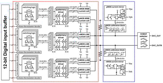 - Huang, C.Y.; Chen, Y.H.; Lin, T.Y.; Liu, S.I. Design of 12-Bit 100-MHz Current-Steering DAC for SoC Applications. In Proceedings of the Fifth International Workshop on System-on-Chip for Real-Time Applications (IWSOC’05), Banff, AB, Canada, 20–24 July 2005; IEEE: Piscataway, NJ, USA, 2005; pp. 117–122. [Google Scholar] [CrossRef]