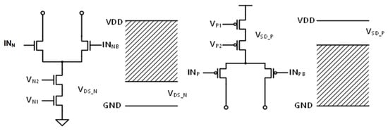 Therefore, to reduce the INL, the output impedance of the current cell should be designed to be large [9]. In addition, when the DAC operates at high speed, abnormal effects, including clock feedthrough, may occur due to the MOSFET switching operation. A current cell with a cascode structure was therefore designed (Figure 4). The output impedance of the current cell was increased using the currentF-source MOSFETs (M0, M1) in a cascode structure. Additionally, by utilizing M1 to separate the switch MOSFETs (M2 and M3) and the current source MOSFET (M0), the effect of clock feedthrough that occurs when operating at high speeds can be reduced. Additionally, by inserting a thick-gate MOSFET between the switch MOSFET and the DAC output, the non-ideal effects of the DAC output stage that may occur due to high-speed switching operations can be mitigated [10,11,12,13,14,15,16]. In this configuration, the pMOS current cell cannot obtain an output up to VDD and the nMOS current cell cannot obtain an output up to GND; thus, the voltage ranges for pMOS and nMOS operations should be secured. Therefore, to design a full-swing DAC, both types of current cells shown in Figure 4 were utilized. As the 12-bit DAC was divided into a 4 + 4 + 5 structure, the W/L design was adjusted such that the current ratio was 512(29):32(25):1. In addition, the output of the pMOS current cell is used from GND to VDD/2, while the output of the nMOS current cell is used from VDD/2 to VDD; in particular, the output of each current cell is selected via the output selection circuit described below.