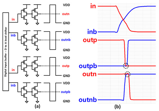 Additionally, as the performance of a DAC, including its linearity, varies depending on the signal driving the current cell, it is crucial to create a driving signal that is suitable for each current cell [8,9]. However, suppose the same switch signal that drives the current cells is implemented in a structure that uses both current cells. In this case, problems such as considerable glitch energy and errors due to asymmetric switch operations may occur. To address this issue in the proposed full-swing current cell, an additional quaternary driver was designed. As shown in Figure 6a, the quaternary driver is configured as a buffer consisting of two stages of inverters, with four buffers per thermometer code. This configuration enables the generation of two types of current cells and input signals, as well as inverted input signals. In order to reduce the glitch of the current cell, the point where the signals (outp, outpb) for driving the pMOS current cell cross over should be set lower than the Vth of the pMOS current cell switch, and the point where the signals (outn, outnb) for driving the nMOS current cell cross over should be set higher than the Vth of the nMOS current cell switch to operate the current cell (Figure 6b).