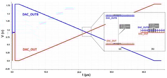 Figure 11 shows the simulation results obtained when applying a ramping input signal to the proposed DAC. Figure 11 presents an enlarged view of the VDD/2 region with two cases: the voltage mismatch without half-power supply calibration and with half-power supply calibration. The proposed DAC employs thick-gate devices and operates with a 1.8 V analog supply voltage, achieving a resolution of 12 bits. Therefore, the 1LSB voltage of the proposed DAC is 0.44 mV. Figure 11 shows that when the half-power supply calibration technique was not applied, the voltage mismatch at VDD/2 was approximately 5.457 mV, resulting in a DNL of about 11.4 LSB. When the half-power supply calibration technique was applied, the voltage mismatch at VDD/2 was approximately 0.381 mV, resulting in a DNL of about 0.86 LSB. Therefore, when the half-power supply calibration technique is applied, the voltage mismatch at VDD/2 can be reduced by more than 92.5%.