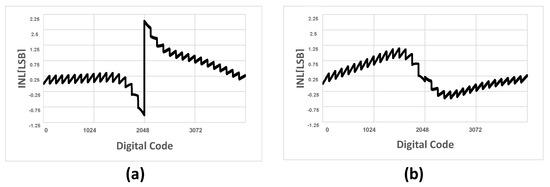 Figure 13 shows the DNL measurement results for the proposed DAC, where Figure 13a,b present the results without and with half-power supply calibration, respectively. Figure 13a shows that the DNL without half-power supply calibration was approximately 3.06 LSB, while that with half-power supply calibration was approximately 0.39 LSB. Therefore, the DNL improved by approximately 2.67 LSB when using half-power supply calibration. Figure 14 shows the INL measurement results for the proposed DAC, where Figure 14a,b present the results without and with half-power supply calibration, respectively. The INL without half-power supply calibration was approximately 2.04 LSB, while that with half-power supply calibration was approximately 1.15 LSB. Therefore, the INL improved by approximately 0.89 LSB when using half-power supply calibration. Figure 13 shows the measured DNL and INL characteristics of the proposed DAC after applying the half-supply calibration. With the calibration enabled, the dominant mismatch at the VDD/2 transition is corrected, and the resulting DNL/INL curves appear considerably smoother compared with the uncalibrated case. The cascode implementation of the current cells also leads to some transistors operating in the linear region over part of the output swing, which lowers the effective output resistance and reduces the visible effect of device mismatch. Consequently, the measured linearity appears more uniform than expected from simulation alone. In addition, the DNL plot exhibits periodic components beyond the mid-code error. These arise from segmentation boundary effects, as the transitions between unary- and binary-coded segments generate repeating switching patterns. Such periodic tones are intrinsic to segmented DAC architectures and, although mitigated by the proposed calibration, they cannot be entirely eliminated.