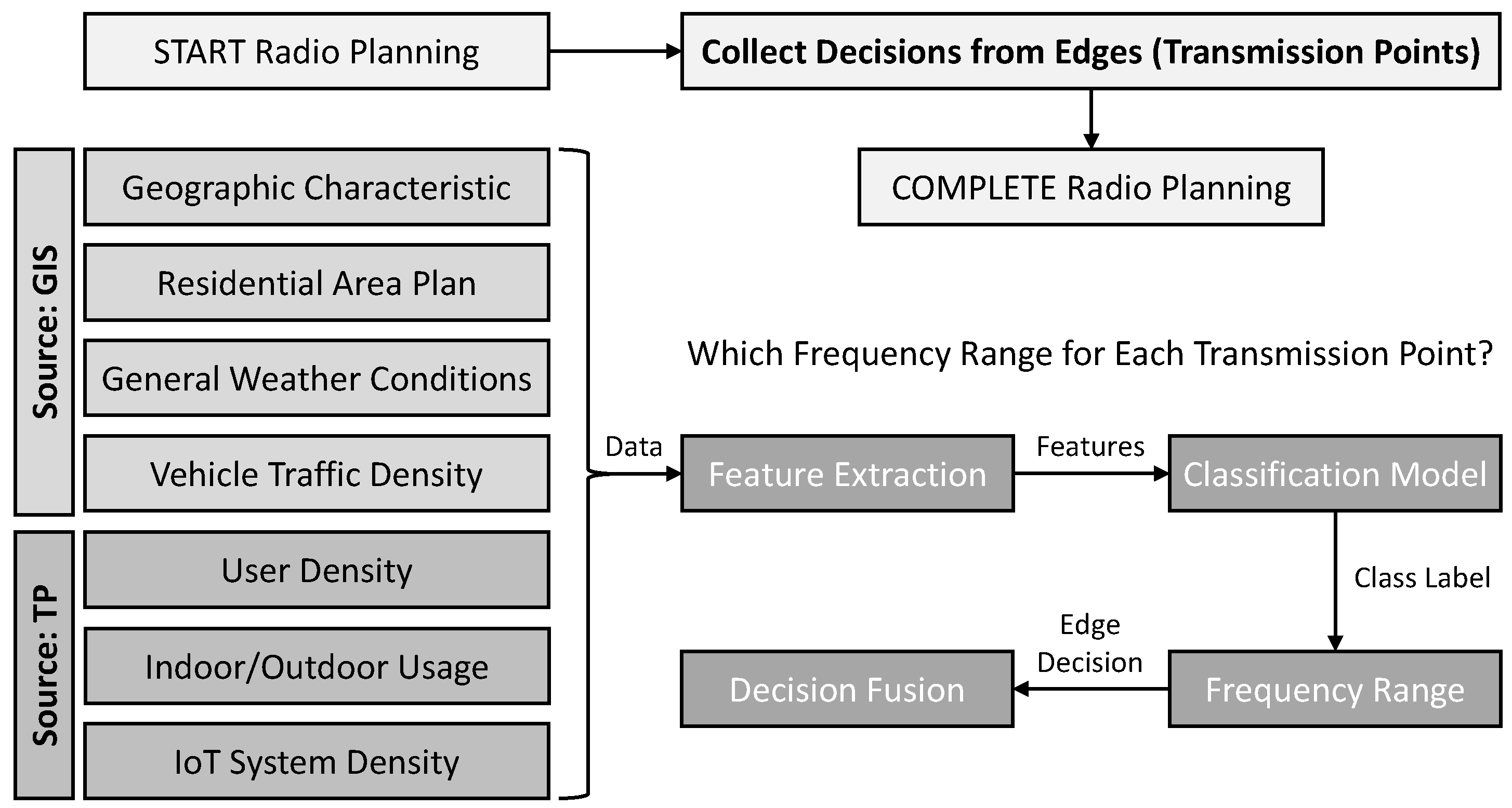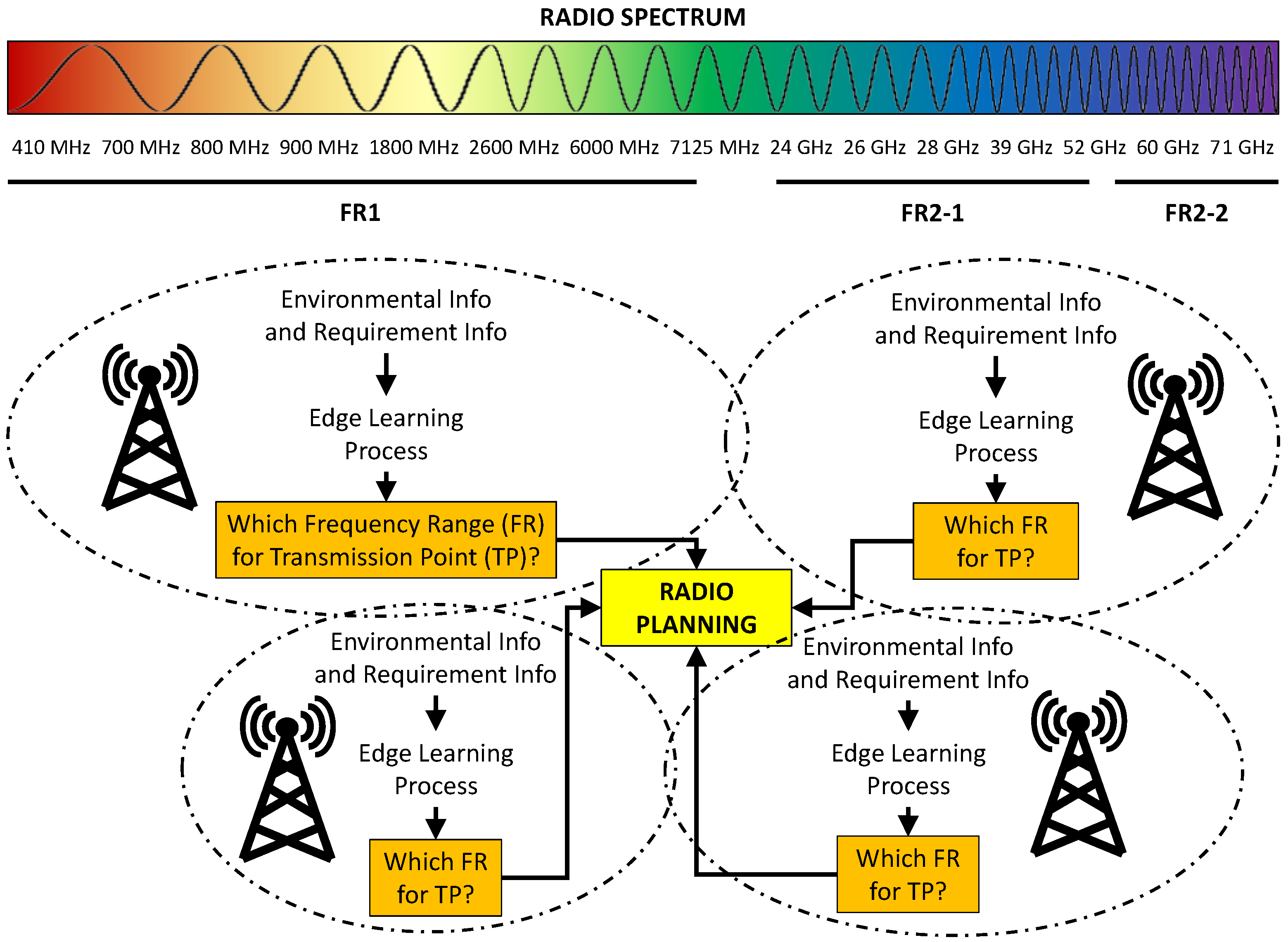Figure 2. At the edges (TPs), information is collected via geographic information system (GIS) and TP, including geographic characteristics, residential area plans, general weather conditions, vehicle traffic density, user density, indoor/outdoor usage, and IoT system density. This information is processed at the edges to determine FR selection (FR1, FR2-1, or FR2-2) for the TP region. ML algorithms are employed to support decision-making at the edges. After that, each edge decision is gathered to complete radio planning for the whole region.