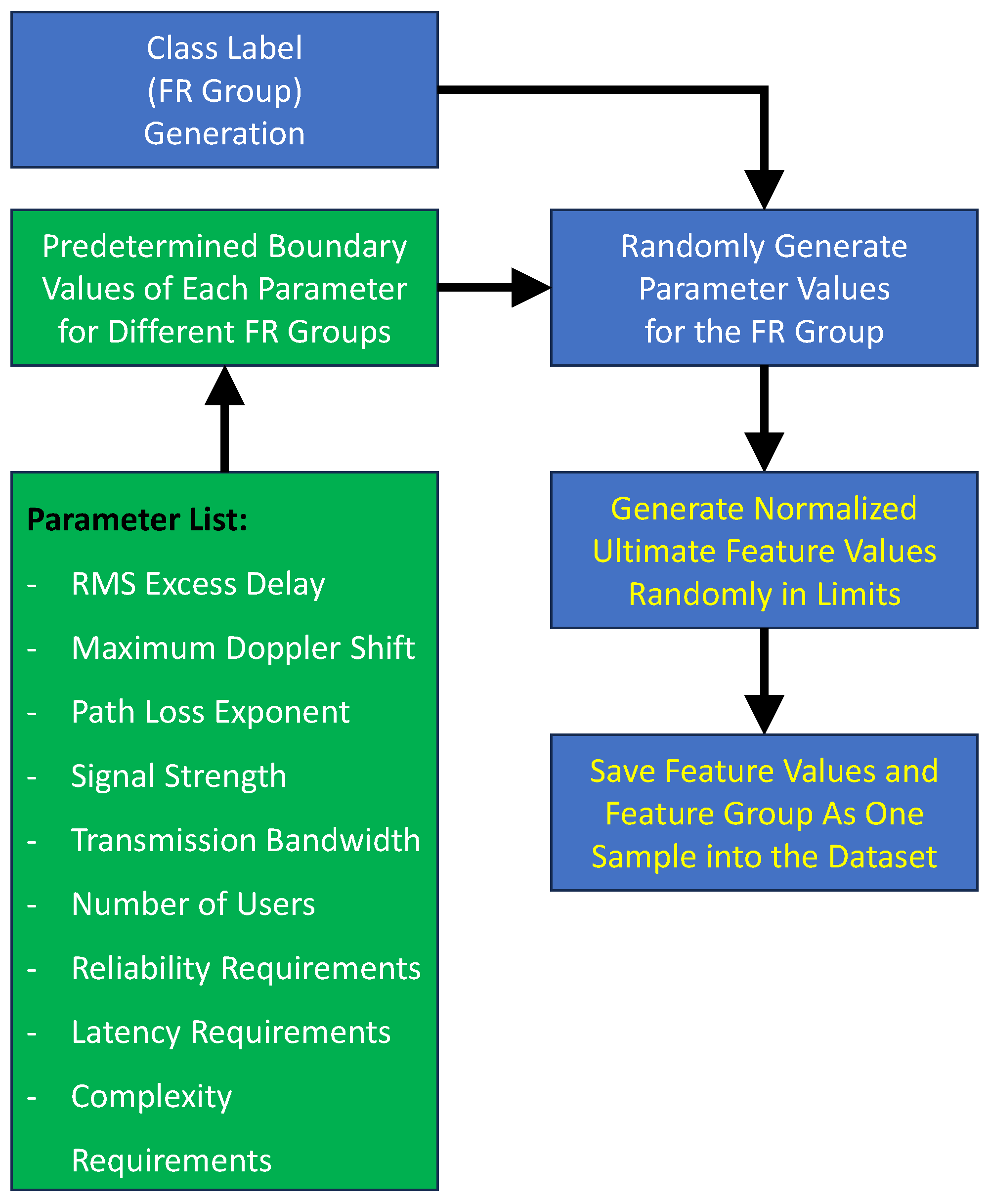 Figure 4, the construction of the synthetic dataset begins with the generation of FR group class labels, followed by the creation of feature values. These features are produced with an element of randomness, guided by the assigned FR groups and their corresponding wireless channel characteristics. Prior to this process, upper and lower bounds are defined to frame the variability of scenario parameters. The entire dataset generation is implemented through a MATLAB script. It is assumed that the resulting feature values are scaled to fall within a normalized range of 1 to 10. Accordingly, basic/rural/scarce/indoor scenarios are mapped to a value of 1, whereas extreme/urban/dense/outdoor scenarios correspond to a value of 10 in the dataset. For instance, if the scenario reflects a harsh environment, the normalized value of the geographic characteristic feature is assigned as 10.