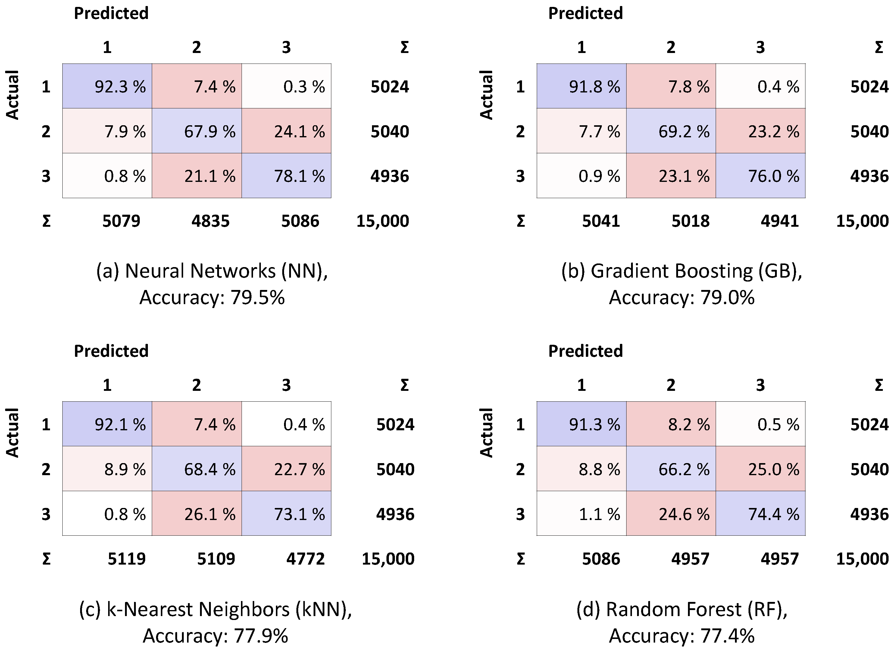 35]. A comparative analysis is performed among several algorithms, including neural networks (NNs), gradient boosting (GB), k-nearest neighbors (kNN), and random forest (RF). Each model undergoes hyperparameter optimization to ensure fair evaluation [