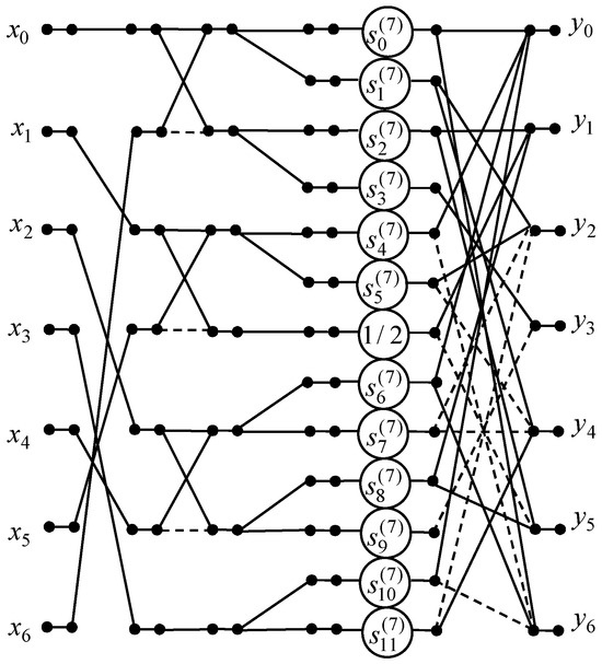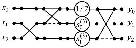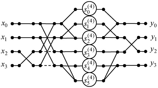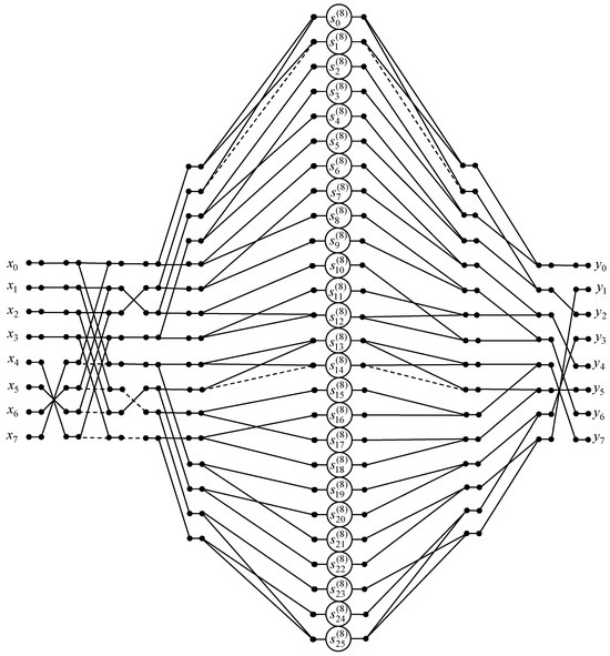 The factorization of the matrix was introduced similarly to the factorization of the matrix [35]. This matrix contains pairs of repeating elements in adjacent columns, and these elements may differ in sign. This structure allows us to extract the butterfly modules using the matrix . The values of the repeating elements were entered into a diagonal matrix , where , , , , , . This matrix was linked to the butterfly modules using the matrix . To calculate the output variables, the matrix