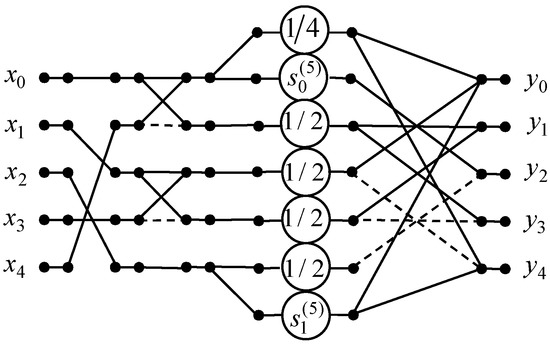 We show a data flow graph of the proposed 5-point DKT algorithm in Figure 3. The initial 5-point DKT requires 4 multiplications, 16 additions, and 21 shifts because four entries of the transform matrix are equal to zero. We have taken into account that multiplication by = 0.25 requires two shifts and multiplication by = 0.5 requires one shift. The developed 5-point DKT algorithm reduces the number of multiplication to 2 because . The number of additions is decreased from 16 to 12, and 6 shifts are required.
