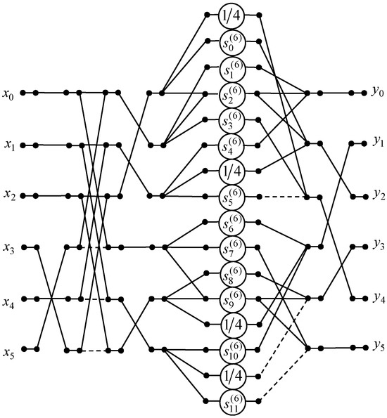 We present the data flow graph for the 6-point DKT algorithm in Figure 4. It should be noted that the initial 6-point DKT requires 28 multiplications, 30 additions, and 16 shifts because = 0.25, and we have 8 such entries in the 6-point DKT matrix . The developed 6-point DKT algorithm reduces the number of multiplications to 12. The number of additions has decreased from 30 to 20, and 8 shifts are required.