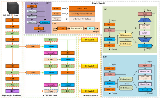- A CNN-based cross-scale feature fusion (CCFF) necking network, the CCFF-ISC neck, is proposed. It employs lightweight 1 × 1 convolution and a dual-path interaction mechanism, and also employs the IRB-SCSA-C2f (ISC) module instead of the traditional C2f module, to improve the feature fusion efficiency and reduce parameter redundancy.